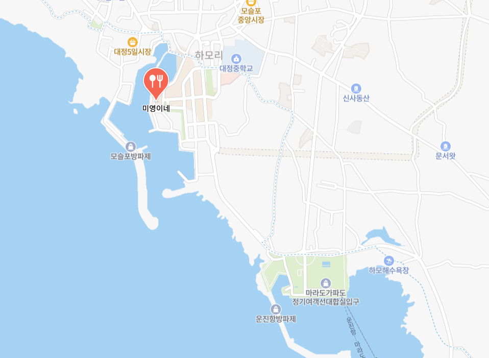 미영이네는 제주특별자치도 서귀포시 대정읍 하모항구로 42에 위치해 있으며, 제주 남서쪽 끝자락 모슬포항 바로 인근에 있어 바다 내음을 가득 머금은 식사를 즐기기 딱 좋은 위치입니다.