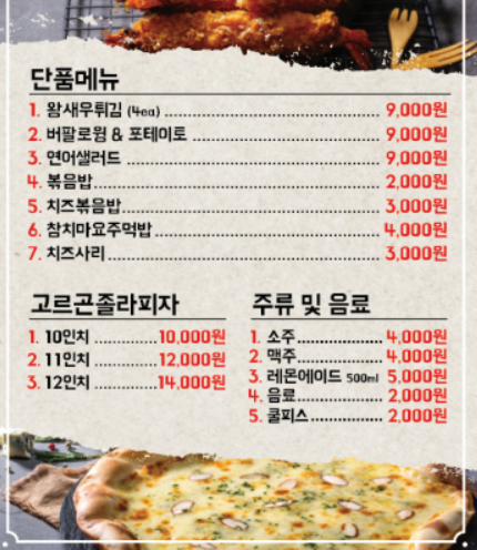 특히 코다리조림은 2인 기준으로 22,000원~26,000원 선인데요, 넉넉한 양 덕분에 여럿이 나눠 먹기에도 좋고, 안주로도 든든합니다. 고르곤졸라 피자는 10,000원대로 맛과 양 모두 만족스러운 구성이라 디저트로 딱이에요.