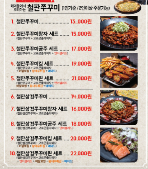 | 철판쭈꾸미 | 불향 가득한 매콤함 | 삼겹살, 주먹밥 |